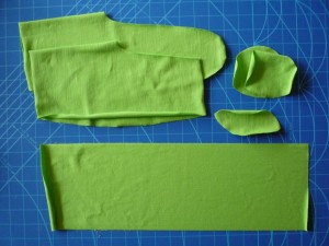 Nastřihněte si všechny díly podle pokynů na střihu. Střih už počítá s přídavkem na švy! Při stříhání dílu na pas, si dejte velký pozor na směr.