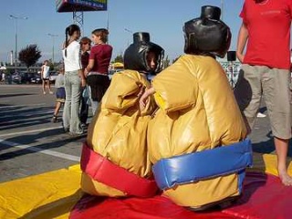 Sumo ring Soutěžící jsou oblečeni do speciálních Sumo obleků a jsou vybaveni rukavicemi a helmami. Atrakce Sumo je určena pro široké spektrum soutěžících a je vhodná pro veškeré firemní, společenské, sportovní či kulturní akce, dny dětí a oslavy narozenin atd. Súčasťou kostýmu je nafukovacia róba, čepiec a fén na lepšie nafukovanie.